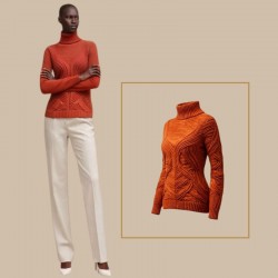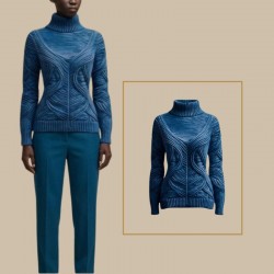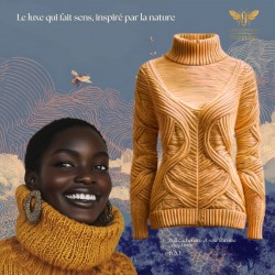 Sa coupe, son col roulé haut et son travail de torsades organiques en relief en font une pièce à la fois moderne et intemporelle.
